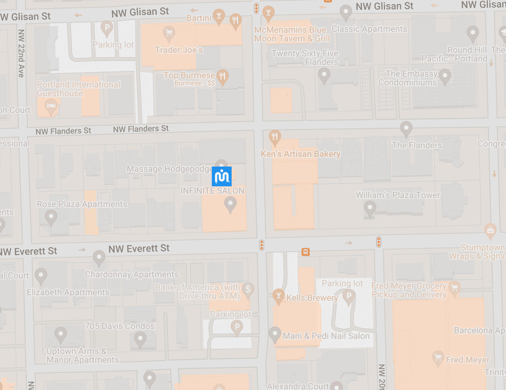 Massage Hodgepodge is on NW 21st in Portland's Nob Hill neighborhood. It is just across from Ken's Artisan Bakery and Rudy's Barbershop.There are four off-street parking spots right in front of the building, but these are not guaranteed to be available.Otherwise, 2-4 hour paid street parking is widely available. Click on the map to see it on Google.